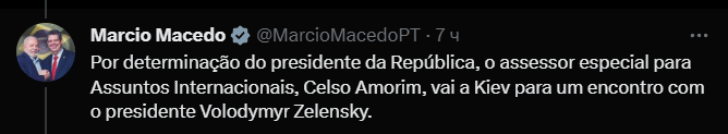 "Президент Лула принял решение и поручил мне сообщить, что специальный помощник по международным вопросам, экс-глава МИД Селсу Аморим посетит Украину", - написал Маседу.