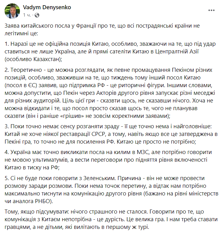 "Украина должна точно вызвать посла на ковер в МИД, но нужно говорить не на языке ультиматумов, а вести переговоры о повышении уровня включенности Китая в давлении на РФ", - пишет Денисенко.
