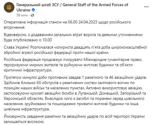 1. За прошедшие сутки РФ нанесла 1 ракетный и 46 авиационных ударов. Совершила около 60 обстрелов из реактивных систем залпового огня по позициям ВСУ и населенным пунктам в Луганской, Донецкой, Запорожской и Херсонской областях. В результате есть погибшие и раненые среди гражданского населения, разрушены и повреждены частные жилые дома и инфраструктура.