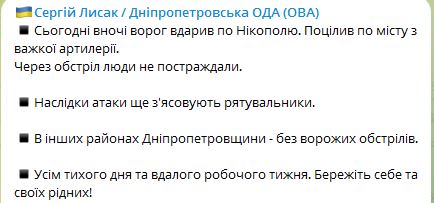07.40 Ночью силы РФ ударили по Никополю в Днепропетровской области.