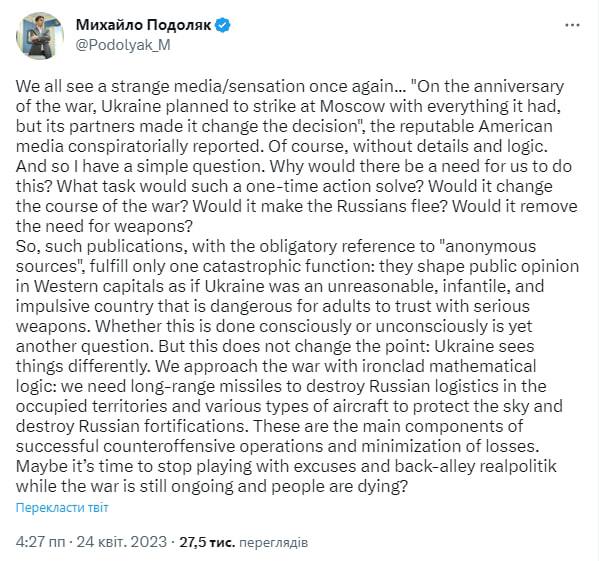 Такие удары планировались в годовщину вторжения - 24 февраля, в том числе и по Москве, но были отменены.