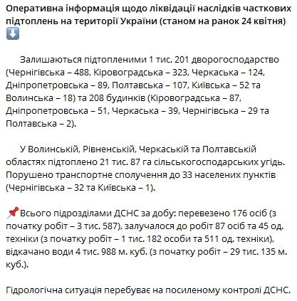 Остаются подтопленными 1 201 дворов и 208 домов в Черниговской, Кировоградской, Черкасской, Днепропетровской, Полтавской, Киевской и Волынской области.