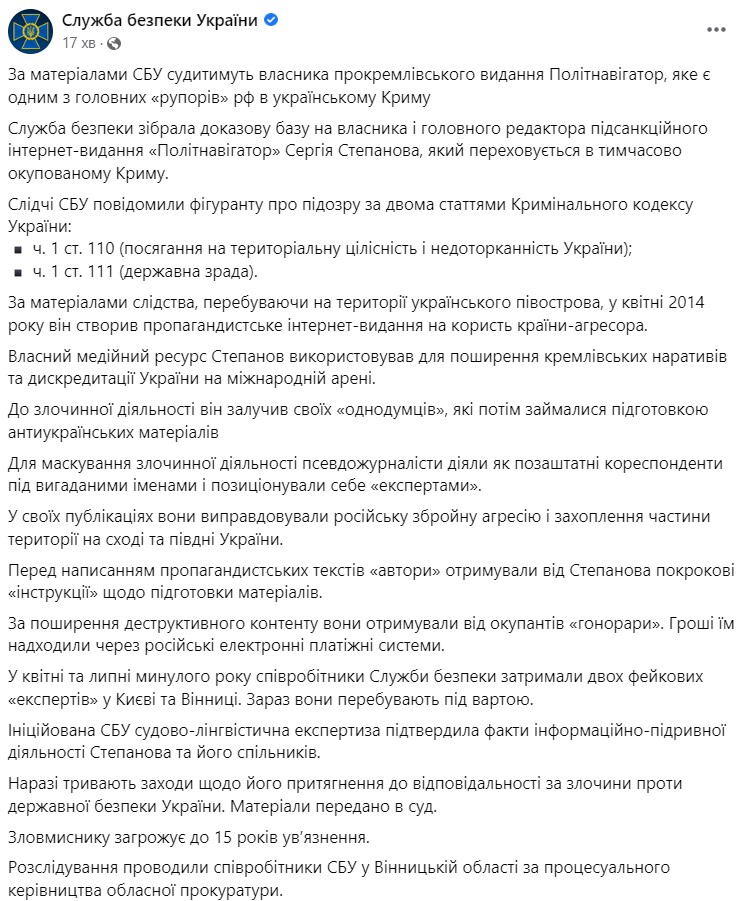 В Украине будут заочно судить владельца и главного редактора сайта "Политнавигатор" Сергея Степанова. Его обвиняют в госизмене и посягательстве на территориальную целостность и неприкосновенность Украины.
