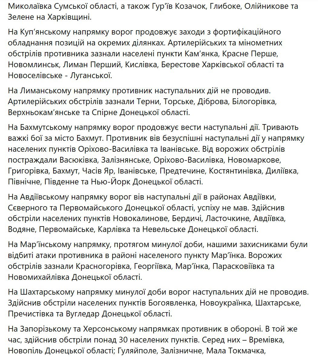 54 атаки за сутки. Тяжелые бои за Бахмут. Утренняя сводка Генштаба