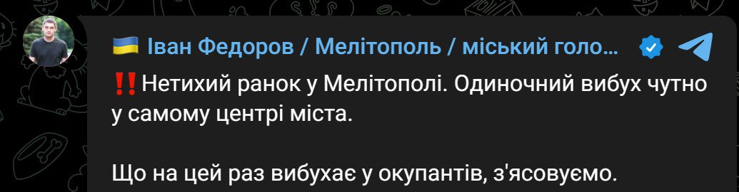 В центре Мелитополя сегодня утром раздался взрыв. О нем сообщил как украинский мэр города Иван Федоров, так и российские СМИ.