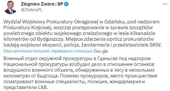 В Польше недалеко от города Замосць обнаружили остатки воздушного военного объекта. Место происшествия сейчас осматривают  эксперты. Оно находится под городом Быдгощ (160 км у югу от Гданьска), рядом с населенным пунктом Замосць.