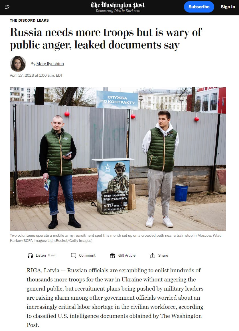 Прошлой осенью в результате "частичной мобилизации" было призвано более 300 000 человек, и еще 50 000, как полагают, воюют в Украине в ЧВК "Вагнер". Также неизвестно количество мужчин, насильно призванных в т.н "ЛДНР".