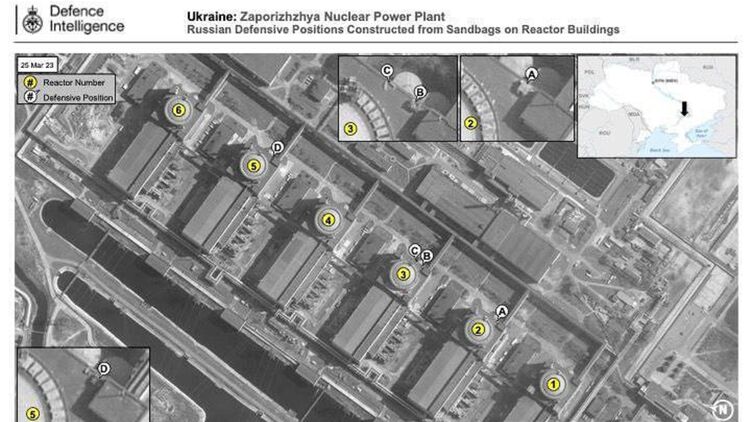 Мешки с песком на крышах реакторов ЗАЭС. Фото: Twitter Минобороны Британии