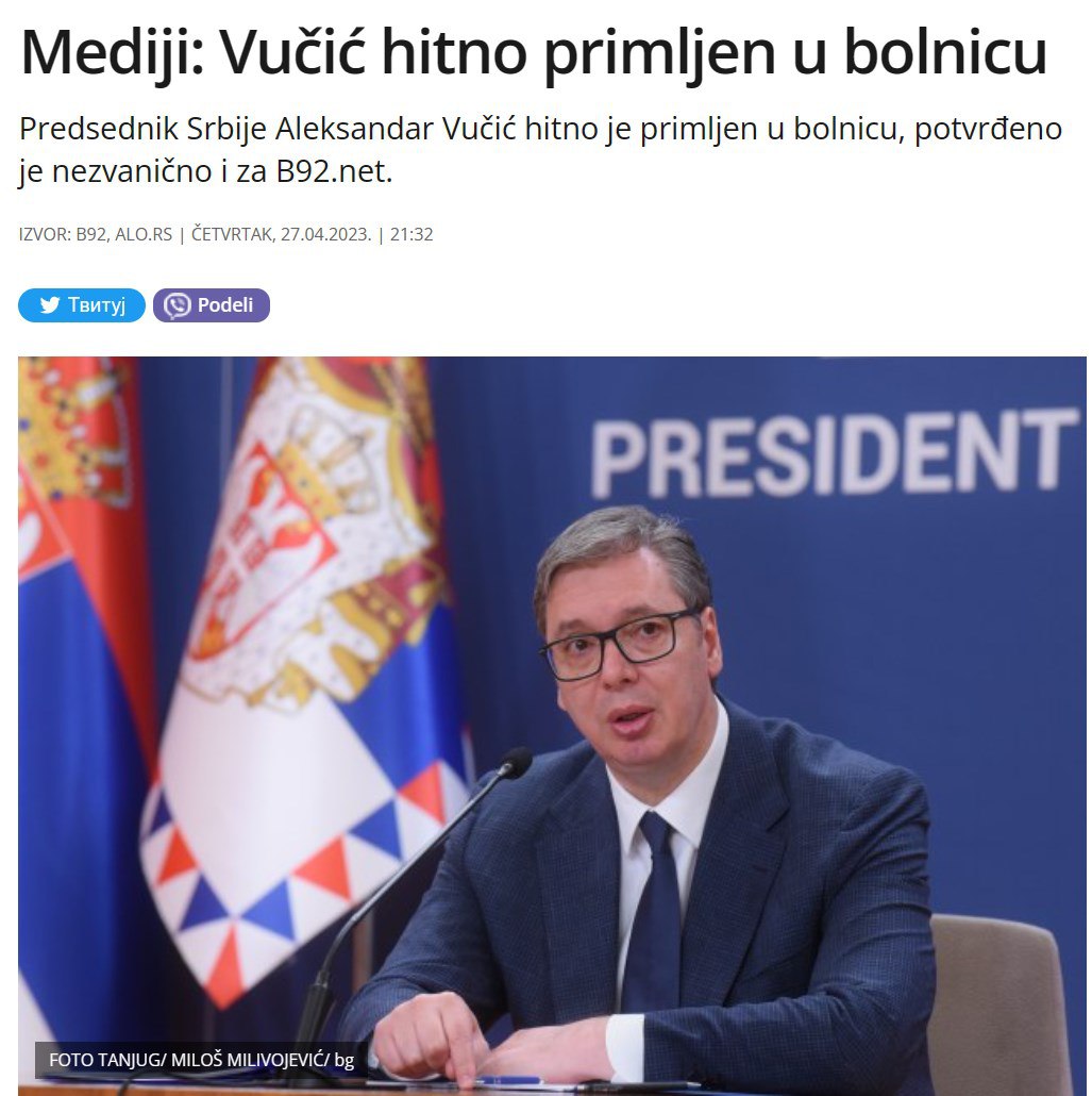По информации радиостанции B92, Александр Вучич обратился за медицинской помощью вчера вечером, 27 апреля, однако не в Военно-медицинскую академию, услугами которой обычно пользуется.