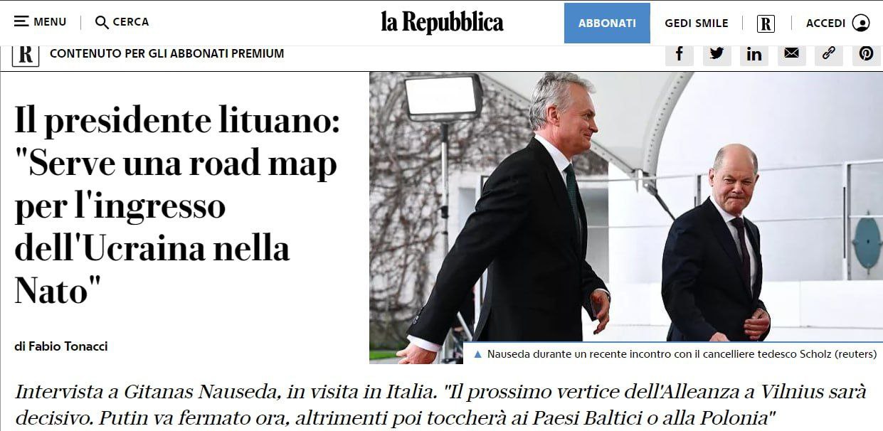 Членство Украины в Североатлантическом альянсе невозможно до окончания войны с Россией, заявил президент Литвы Гитанас Науседа в интервью итальянской La Repubblica.