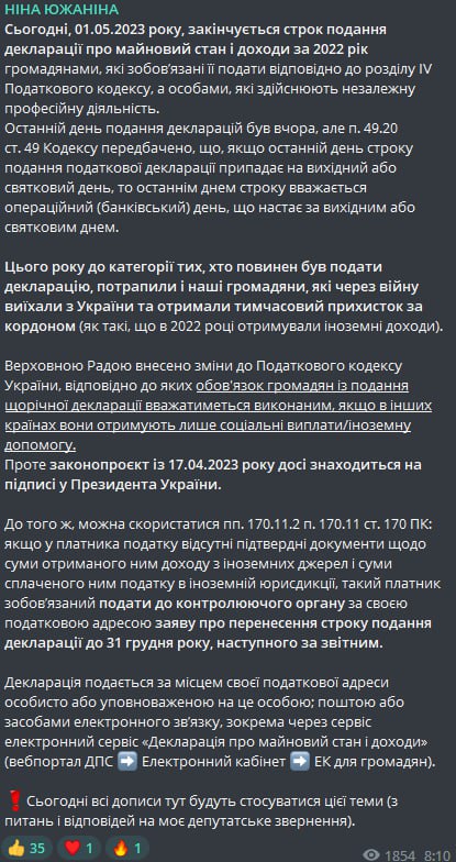 По ее словам, законопроект, отменяющий для беженцев подачу деклараций, до сих пор не подписан президентом Владимиром Зеленским, а значит, в силу не вступил.
