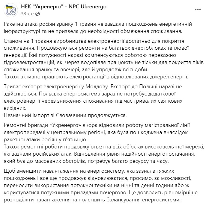 Продолжается экспорт электроэнергии в Молдову. Экспорт в Польшу пока не осуществляется.