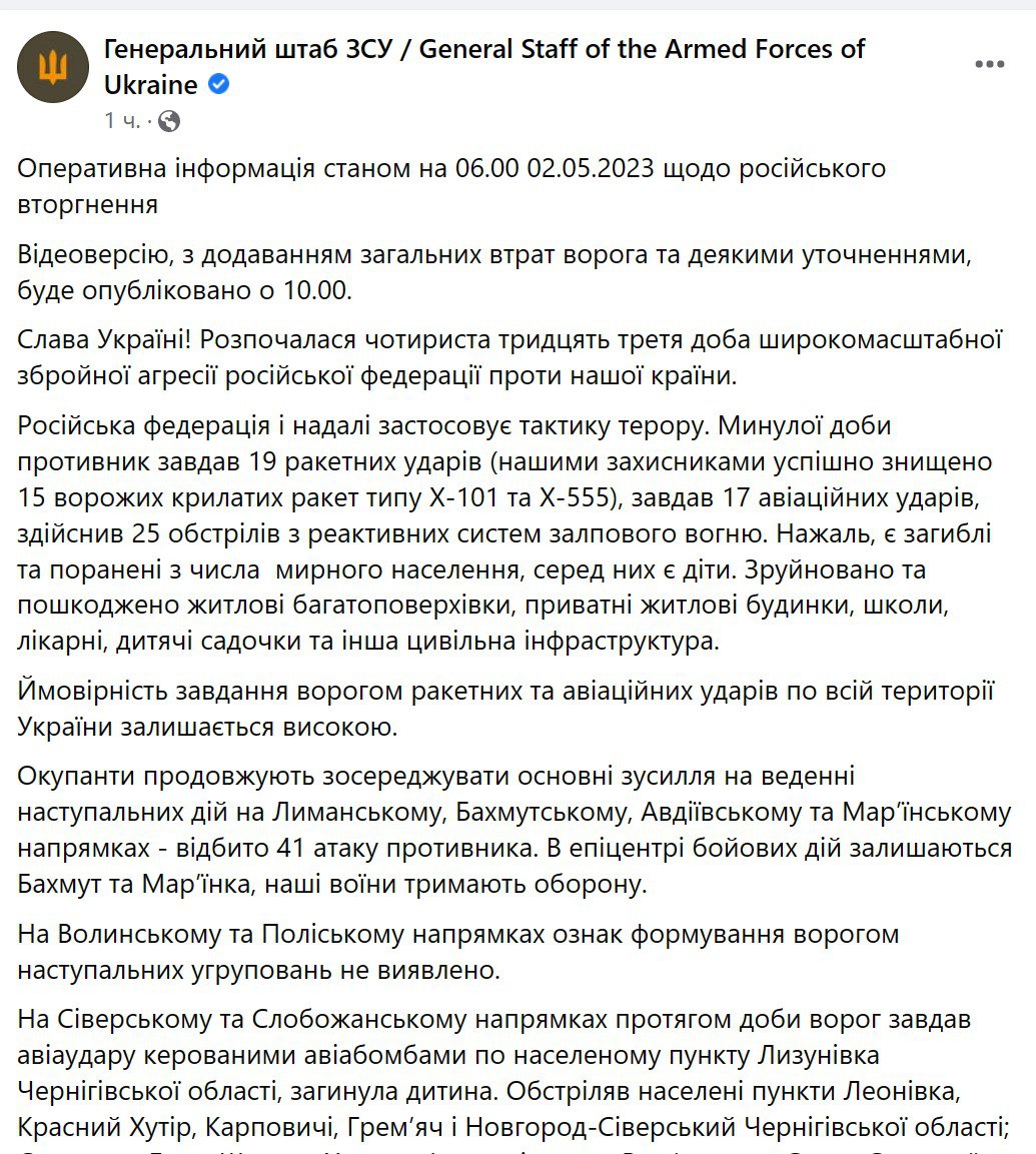 Во вторник, 2 мая, в Украине идет уже 433-й день войны с РФ.