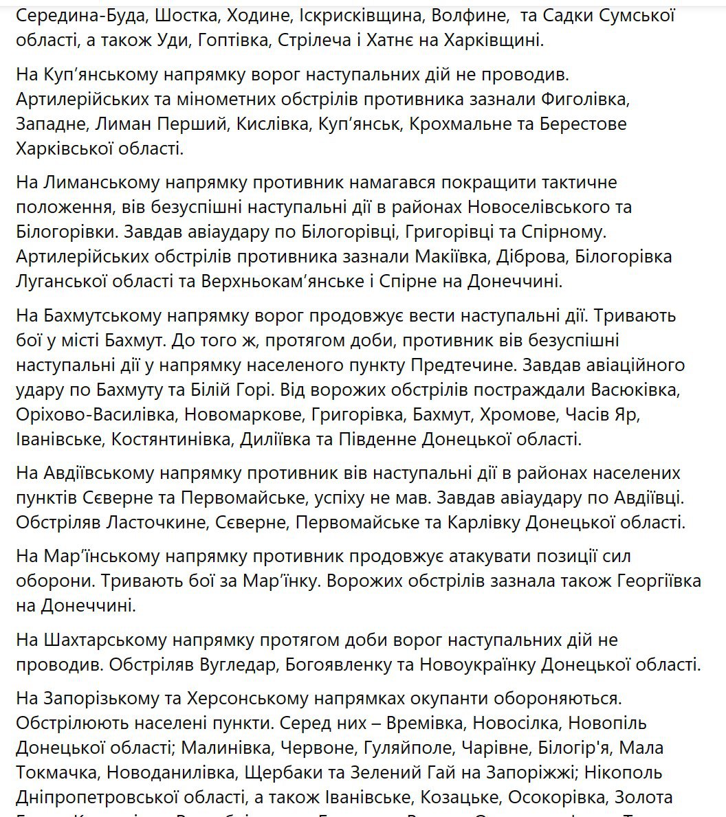 Продолжаются бои за Бахмут, также были попытки наступления на Предтечино. Россияне нанесли авиаудары по Бахмуту и Белой Горе.