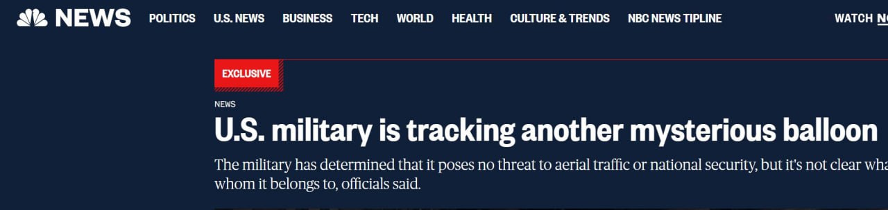 08.14 Над территорией США летит очередной неизвестный шар, пишет телеканал NBC News со ссылкой на трех официальных лиц.