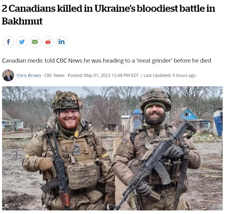 09.25 В боях за дорогу снабжения Бахмута погибли бывшие канадские военные, которые вступили добровольцами в Интернациональный легион, сообщает CBC News со ссылкой на командира военнослужащих.