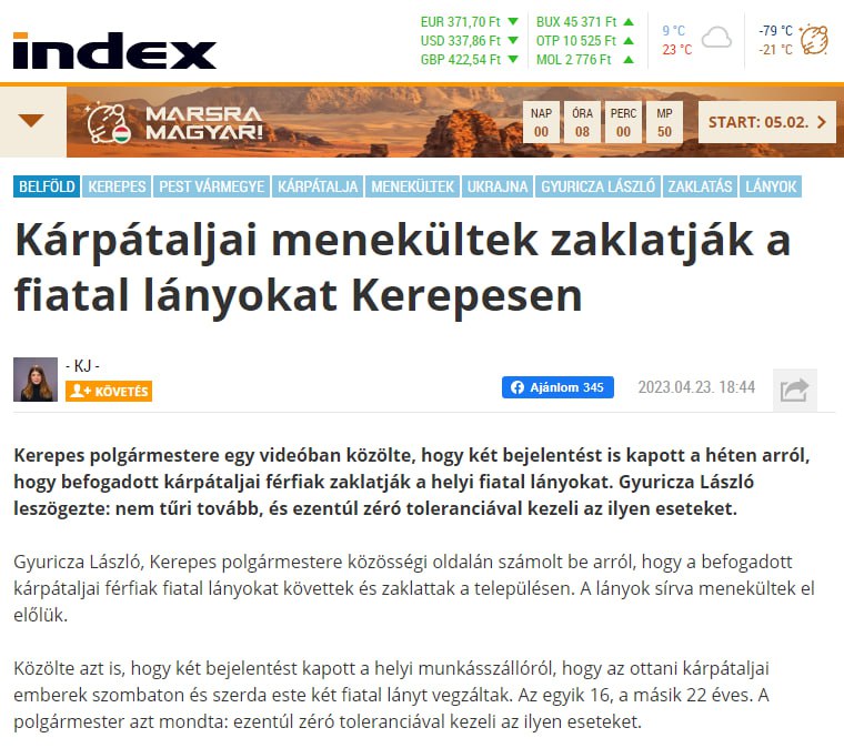 11.08 Мэр венгерского Керепеша грозит украинским беженцам "нулевой терпимостью".