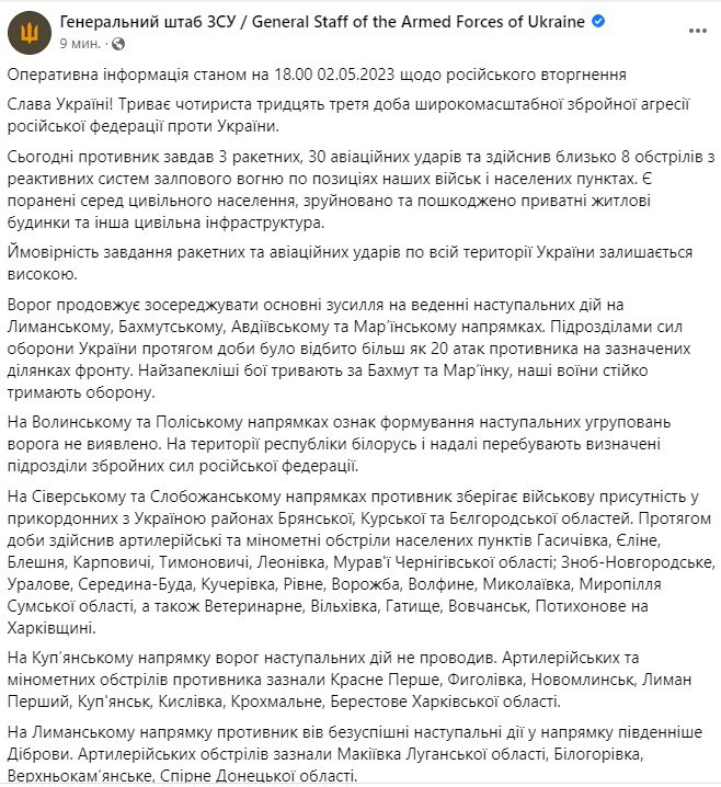 Война в Украине продолжается уже 433-й день. Мы следим за новостями 2 мая в своем онлайне.