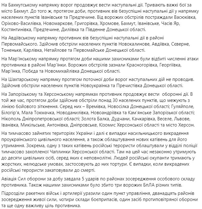 За минувшие сутки эпицентр боевых действий по-прежнему находится Бахмуте и Марьинке. Отбито 20 атак противника на обозначенных участках фронта, сбито 3 вражеских БПЛА и нанесено 5 ударов по местам сосредоточения личного состава противника.