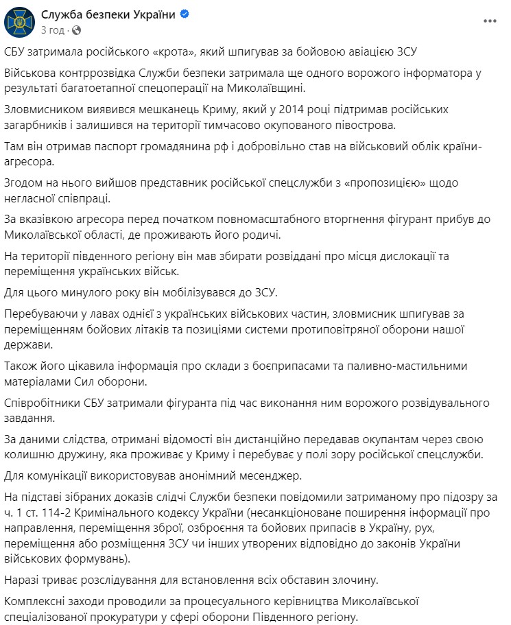 По данным СБУ, находясь в рядах одной из украинских воинских частей, он шпионил за перемещением боевых самолетов и позициями системы противовоздушной обороны Украины.