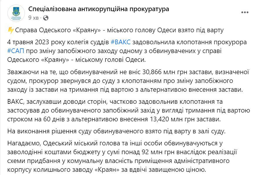 Высший антикоррупционный суд взял его под стражу на 60 дней с правом внесения залога в 13 миллионов гривен.