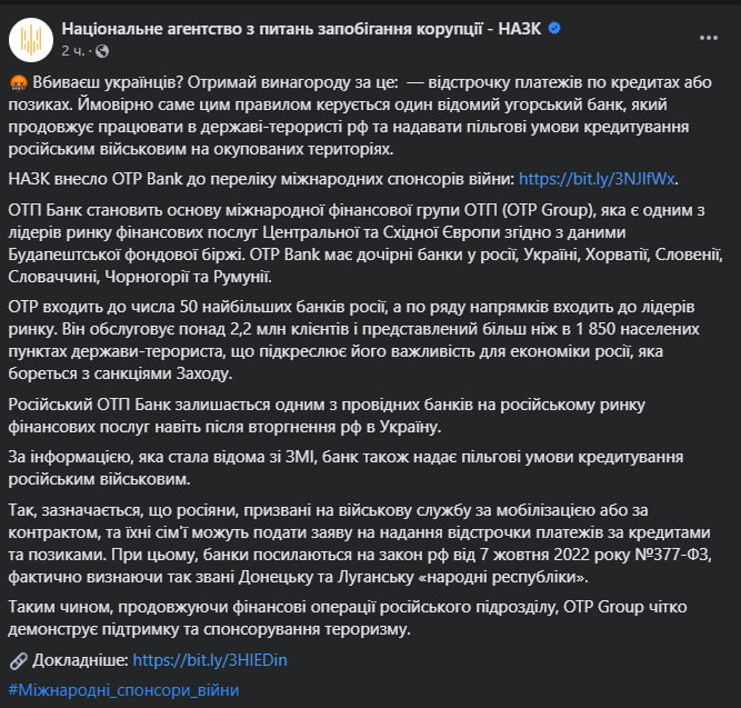 НАПК сообщило о внесении венгерской банковской группы OTP Bank Group в перечень международных спонсоров войны. Причина - льготные условия кредитования для российских военных.