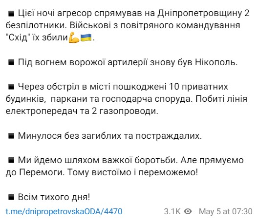 В ночь с 4 на 5 мая под вражеской артиллерией оказался Никополь Днепропетровской области. Из-за обстрелов в городе повреждены десять частных домов, заборы и хозяйственное сооружение. Разбиты линия электропередач и два газопровода.