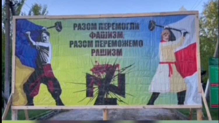 "Война баннеров" на украинско-белорусской границе продолжается. Вдоль границы с Беларусью появились новые баннеры, на которых изображен украинец и беларус в национальной одежде с кувалдами, которые замахиваются на свастику, собранную из двух символов вторжения "Z".