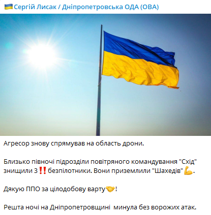 Ночью 10 мая над Днепропетровской областью силы ПВО сбили, выпущенные РФ дроны.