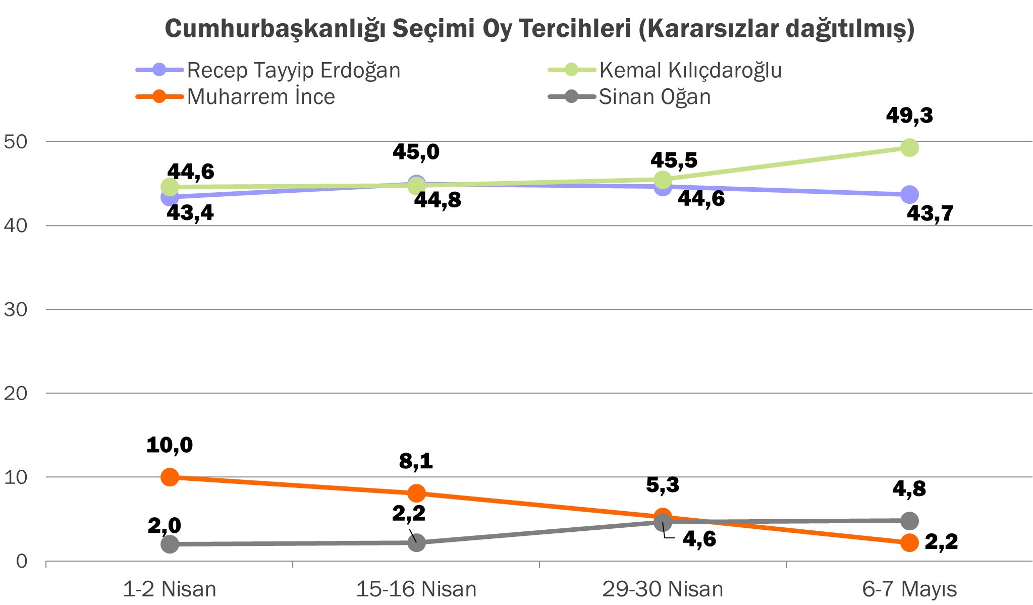 Поддержка двух остальных кандидатов несопоставимо ниже – 4,8% для Синана Огана и 2,2% для Мухаррема Индже. При этом, отмечается в сообщении KONDA, их избиратели склонны во втором туре проголосовать за оппозиционного кандидата, то есть, за Кылычдароглу. (На момент публикации новости начали поступать сообщения, что Мухаррем Индже снялся с выборов - Ред.)