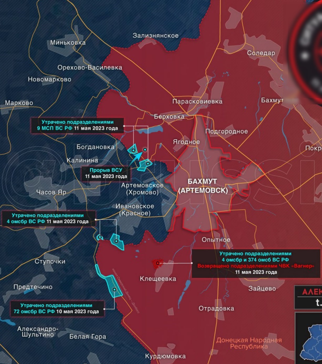Утром связанные с Пригожиным телеграм-каналы сообщили, что подразделения российской армии оставили позиции к северо-западу от Бахмута. В частности, солдаты 9-го мотострелкового полка, как утверждают каналы, отступили в районе Богдановки и около трассы Часов Яр - Бахмут.