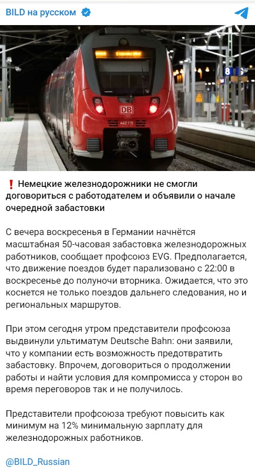 Напомним, в конце марта в Германии прошла крупнейшая за 30 лет забастовка железнодорожников и авиаперевозчиков. Организаторы - профсоюзы EVG и Verdi. Verdi призывали увеличить зарплату работникам на 10,5 процента, причем не менее 500 евро в месяц. Союз EVG выступал за повышение зарплаты работникам немецких железных дорог на 12 процентов, но не менее чем на 650 евро в месяц.