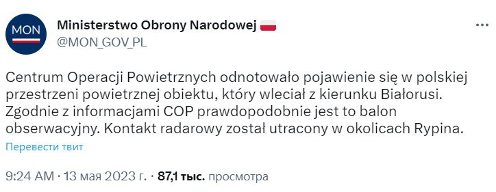 "В Центре воздушных операций отметили появление в воздушном пространстве Польши объекта, прилетевшего со стороны Беларуси. По информации КС, вероятно, это аэростат наблюдения. Радиолокационный контакт был потерян под Рыпиным", – пишет ведомство.