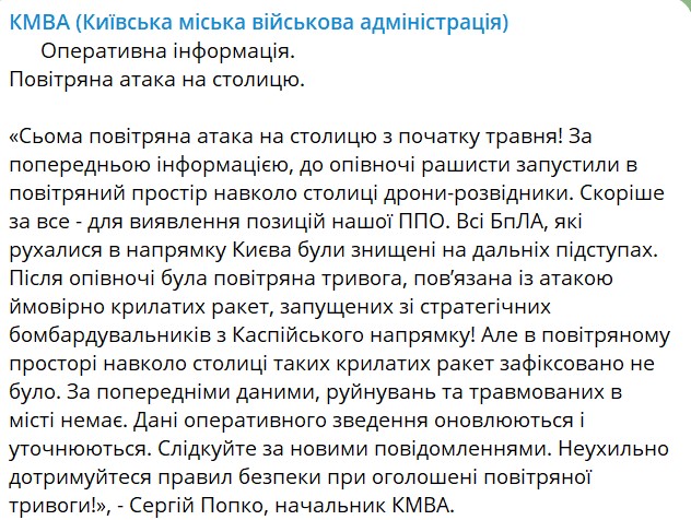 В Киевской военной администрации рано утром заявили об атаке крылатыми ракетами со стороны Каспия, но в пространство столицы они не входили.