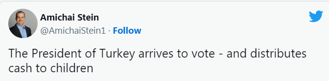 "Президент Турции Эрдоган прибыл на участок для голосования, где раздает деньги детям", — пишет Амичай Штайн в Twitter, публикуя соответствующее видео.