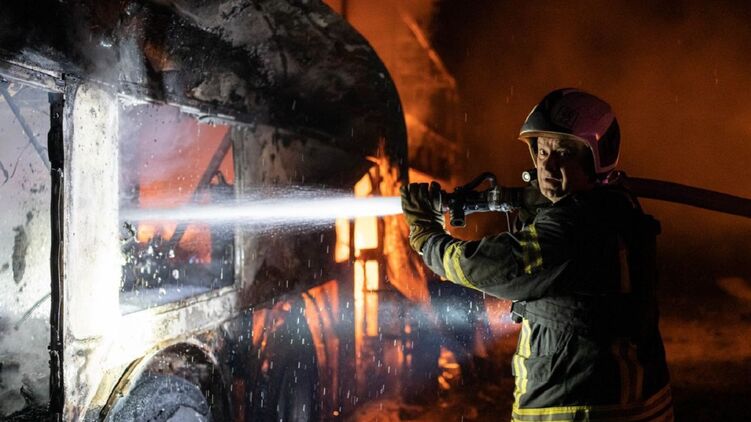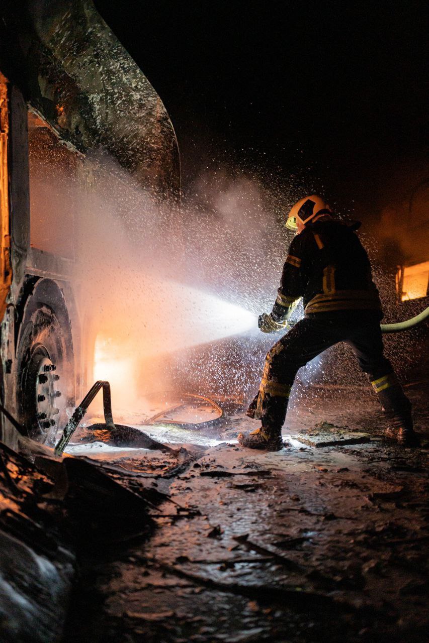 А в Соломенском районе Киева из-за падения обломков ночью горел транспорт. На фото, опубликованных ГСЧС, видны сгоревшие автобусы.