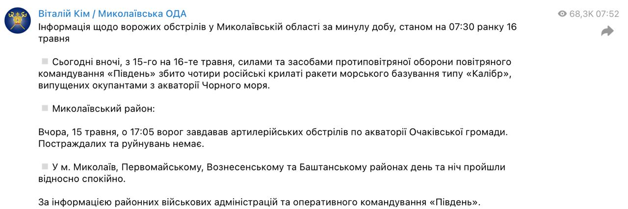 Только над Николаевской областью ночью были сбиты четыре ракеты "Калибр", выпущенные из Черного моря, сообщает губернатор Виталий Ким.