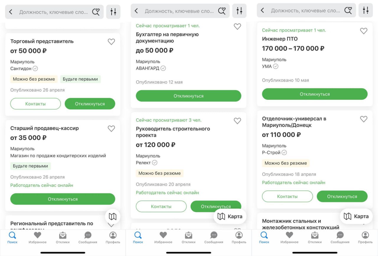Нанимают работников и в Мариуполе. На сайте вакансий hh.ru по состоянию на 15 мая было опубликована 101 вакансия. Самые популярные — тоже строительные, а именно: