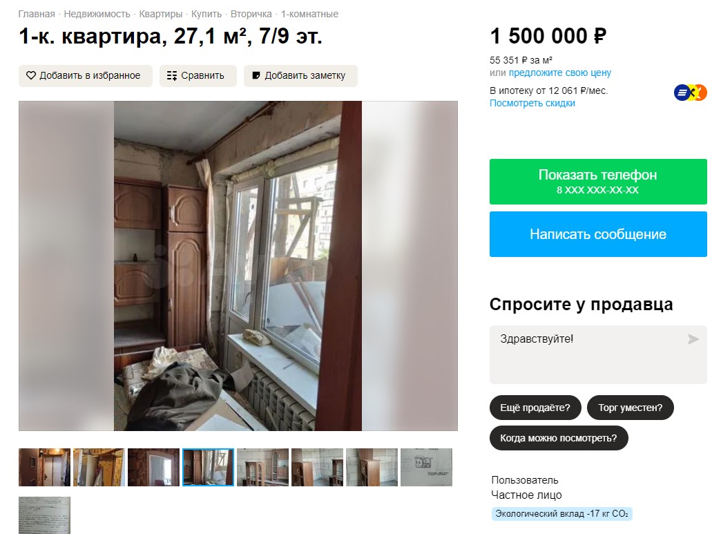 "Во время "СВО" дом практически не пострадал, ведется капитальный ремонт всего дома. Квартира не пострадала, только штукатурка осыпалась и т.п. Дом располагается в спальном районе. До моря 20-30 минут пешком. Школа и детский сад в 3 минутах ходьбы", — пишет собственник и просит 1,5 млн рублей (700 тысяч гривен).
