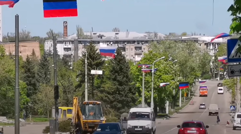 В городе масса элементов "русского мира": флаги "ДНР" и России, приглашение к участию в российских праймериз на местные "выборы" 10 сентября, баннер про Крым, стела, выкрашенная в цвета российского флага.