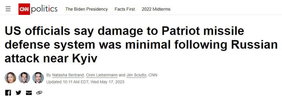 21:29 Комплекс ПВО Patriot в Украине поврежден, но находится в рабочем состоянии.