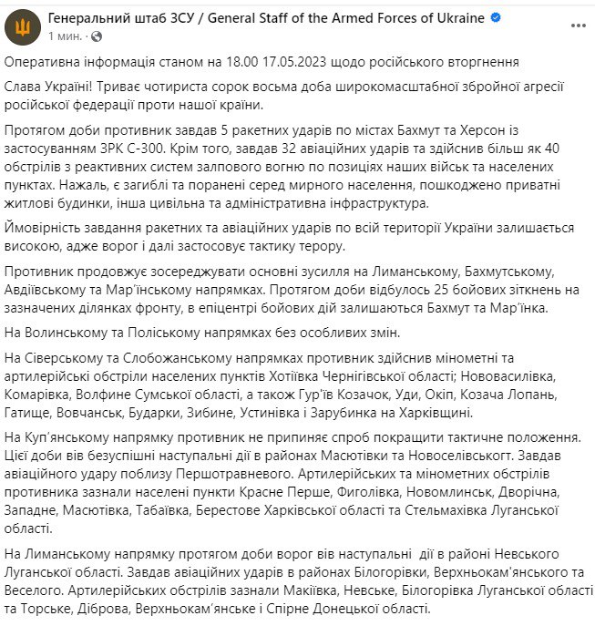 21:15 Минобороны РФ утверждает, что «по достоверно подтверждённым данным», 16 мая в результате удара гиперзвуковым ракетным комплексом «Кинжал» в Киеве были «поражены и полностью уничтожены многофункциональная радиолокационная станция, а также 5 пусковых установок зенитного ракетного комплекса «Пэтриот» производства США».