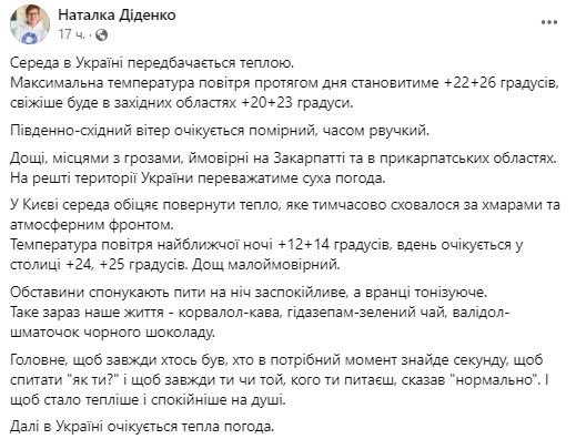 Синоптик Наталья Диденко пишет, что среда в Украине будет теплой. Максимальная температура воздуха в течение дня составит +22...+26. Холоднее будет в западных областях +20...+23.