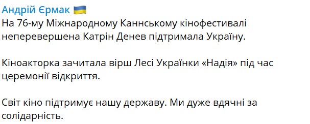 "На 76-м Международном Каннском кинофестивале непревзойденная Катрин Денев поддержала Украину. Киноактриса зачитала стихотворение Леси Украинки "Надежда" во время церемонии открытия. Мир кино поддерживает наше государство. Мы очень благодарны за солидарность", - написал глава Офиса президента Андрей Ермак в Telegram.