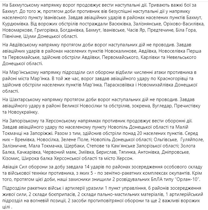 - Атаки отбиты: на Купянском направлении – в районе Масютовки и Новоселовского; Лиманском – в районе Невского Луганской области; Бахмутском – в Бахмуте и в направлении Ивановского; Марьинском – в районе Марьинки.