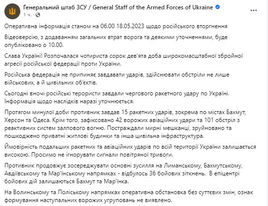 В четверг, 18 мая, Генштаб ВСУ обнародовал сводку о ситуации на фронте.