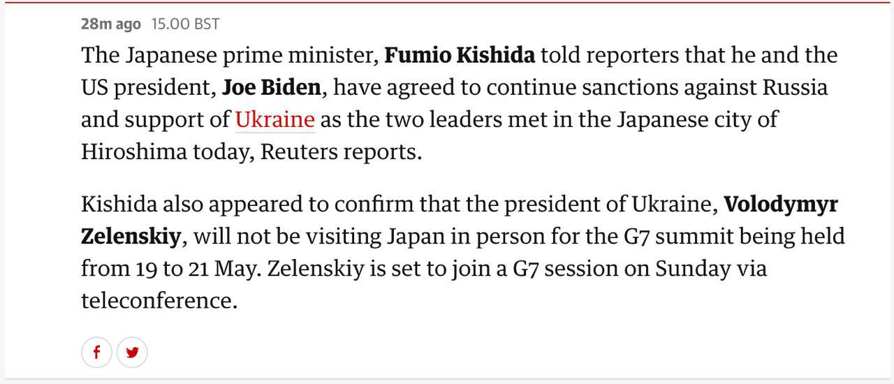 Ранее замглавы Офиса президента Игорь Жовква говорил, что Зеленский может лично посетить саммит, который пройдет в Японии 19-21 мая.