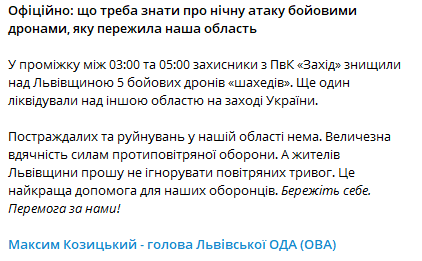 Еще один дрон был сбит над другой областью на западе Украины. В какой именно - не уточняется.