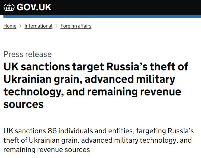Как подчеркивается в пресс-релизе правительства Великобритании, новые санкции обусловлены "кражей украинского зерна" и направлены против передовых военных технологий и "оставшихся источников доходов" России.