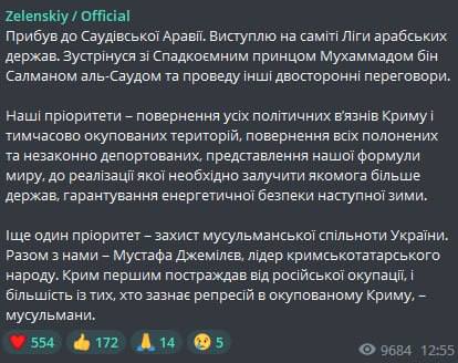 "Встречаюсь с наследным принцем Мухаммадом бин Салманом аль-Саудом и проведу другие двусторонние переговоры. Наши приоритеты – возвращение всех политических заключенных Крыма и временно оккупированных территорий, возвращение всех пленных и незаконно депортированных, представление нашей формулы мира, к реализации которой необходимо привлечь как можно больше государств, обеспечение энергетической безопасности следующей зимой", - заявил Зеленский.